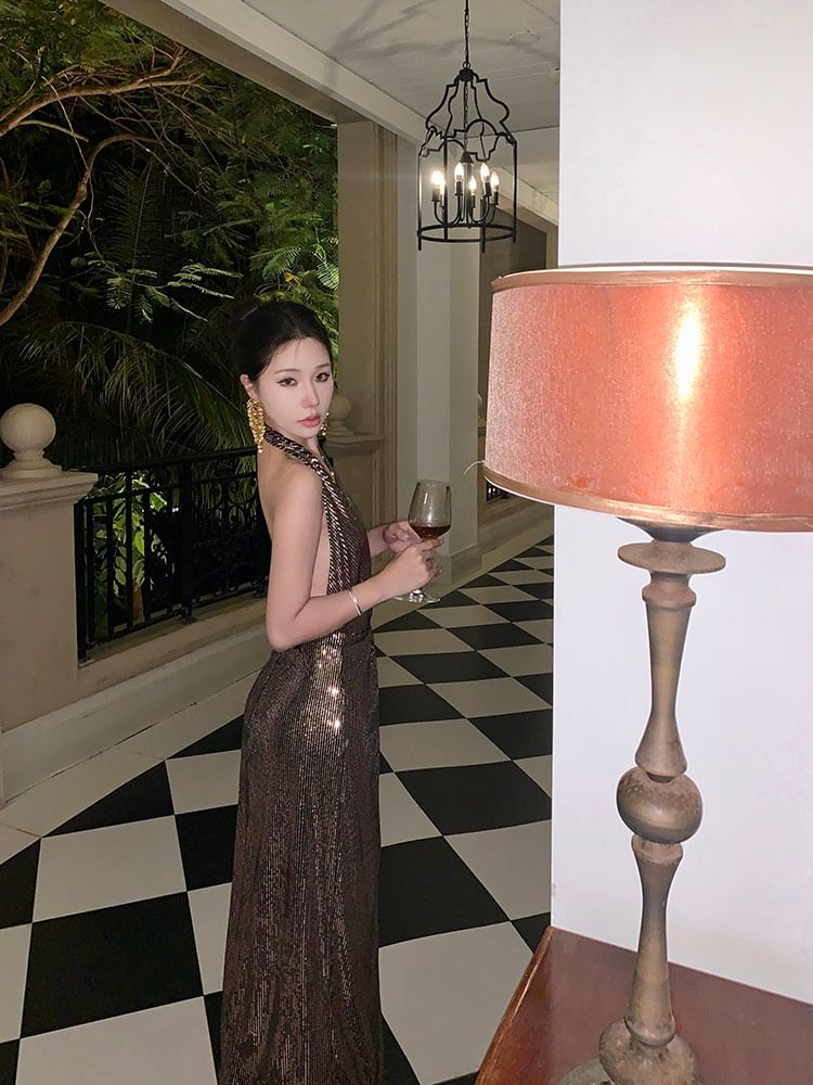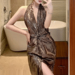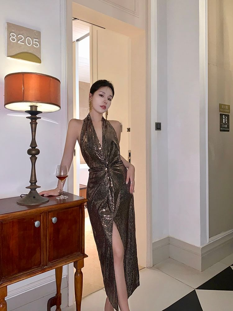 Turn the night into your runway with this Halter Metallic Sequin Twist Slit Maxi Dress, crafted to command attention. Designed with a flattering sheath silhouette and high-impact shimmer, this gown is perfect for upscale evenings, red carpet events, or glamorous parties.
